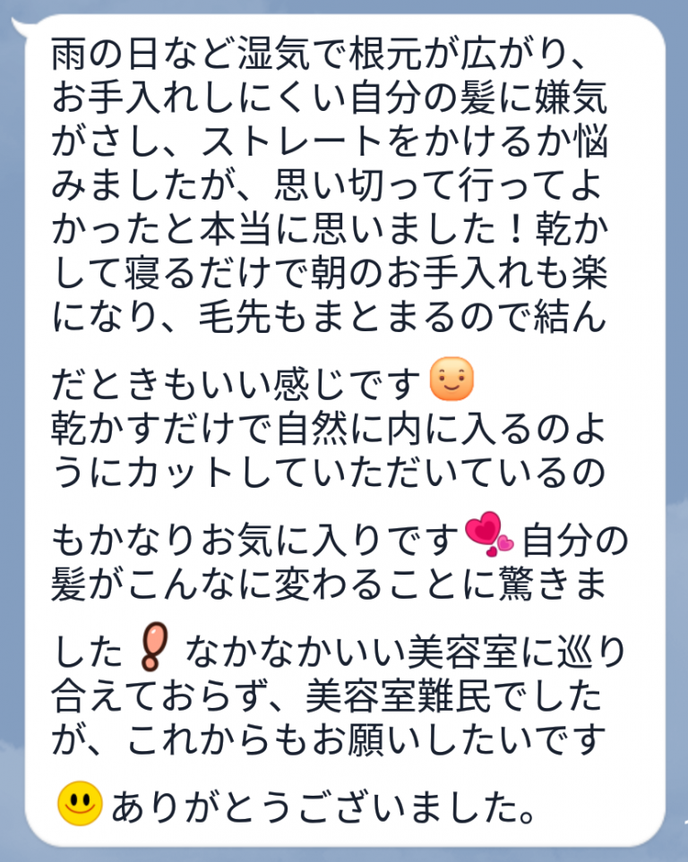 【地域名】【美容室】【縮毛矯正】【白髪染め】【ほうとう体験】【個室】【飲み放題】などサービスを表すワードをタイトルに必ず入れてください。